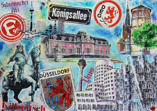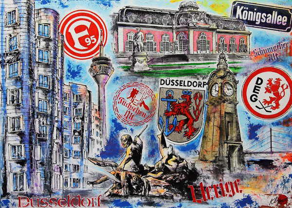 Düsseldorf-Bilder mit Motiven aus der Altstadt wie dem Schlossturm, Jan Wellem auf dem Rathausplatz, dem Radschlägerbrunnen und der Lambertuskirche sind besonders beliebt. Die Unikate sind handgemalt, ohne Foto-, Kopier-, Photoshop- oder Printtechniken, und deshalb besonders geschätzt. Die Originalgemälde werden mit Pinsel und Acryl auf hochwertige Künstlerleinwand aufgetragen, keine bemalten Fotos. Die Bilder entstehen in mehreren Arbeitsgängen, wobei die hohe Qualität der Farben aus dem Künstlerfachhandel und ein Schutzlack dafür sorgen, dass die Stadtbilder lichtbeständig sind und ihre überdurchschnittliche Farbintensität und Leuchtkraft erhalten bleibt.